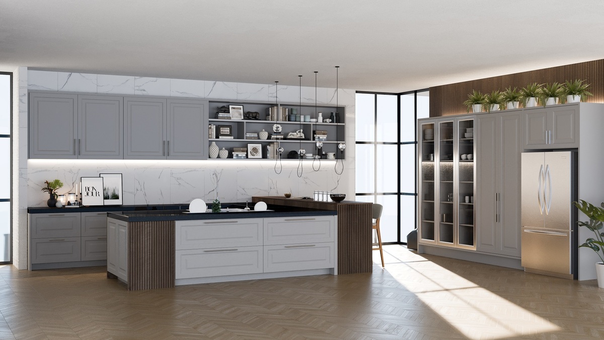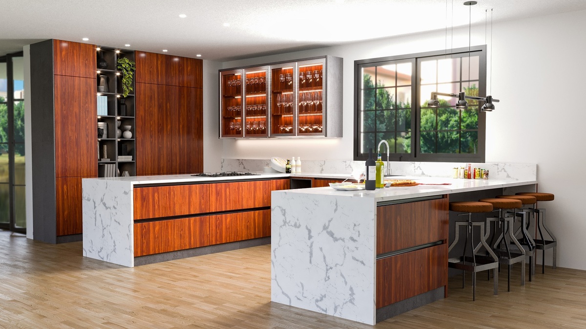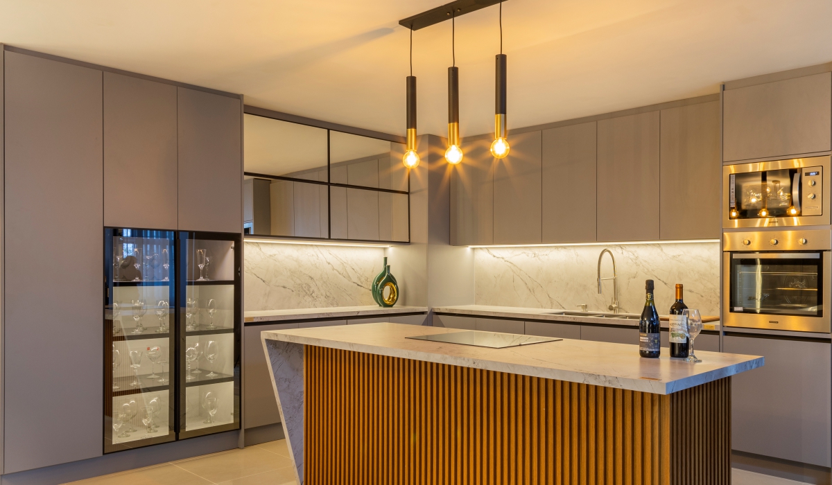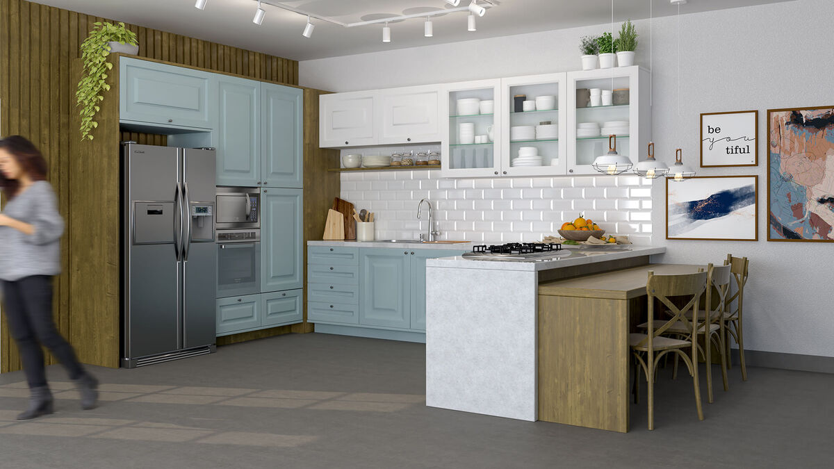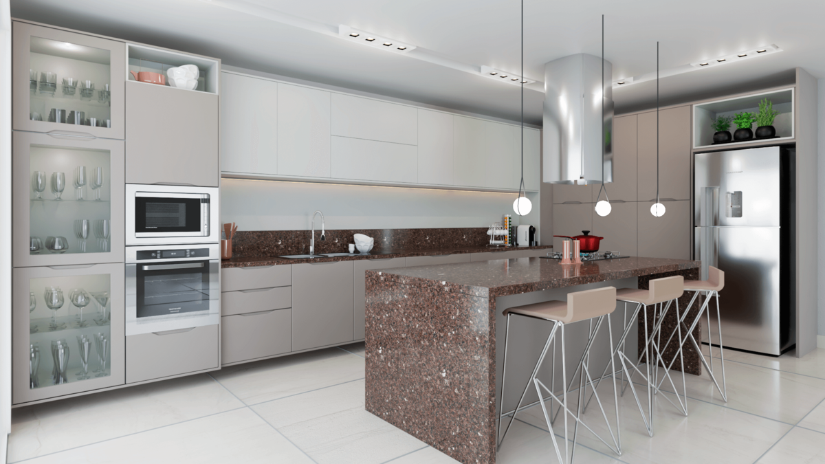 - Cozinha com ilha: adiciona uma ilha central, perfeita para interação e funcionalidade extra, especialmente em cozinha conceito aberto ou em ambientes com sala e cozinha integrada.