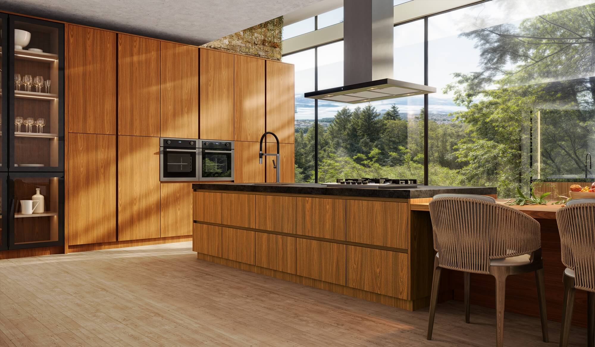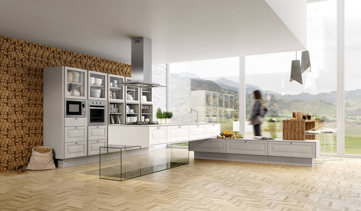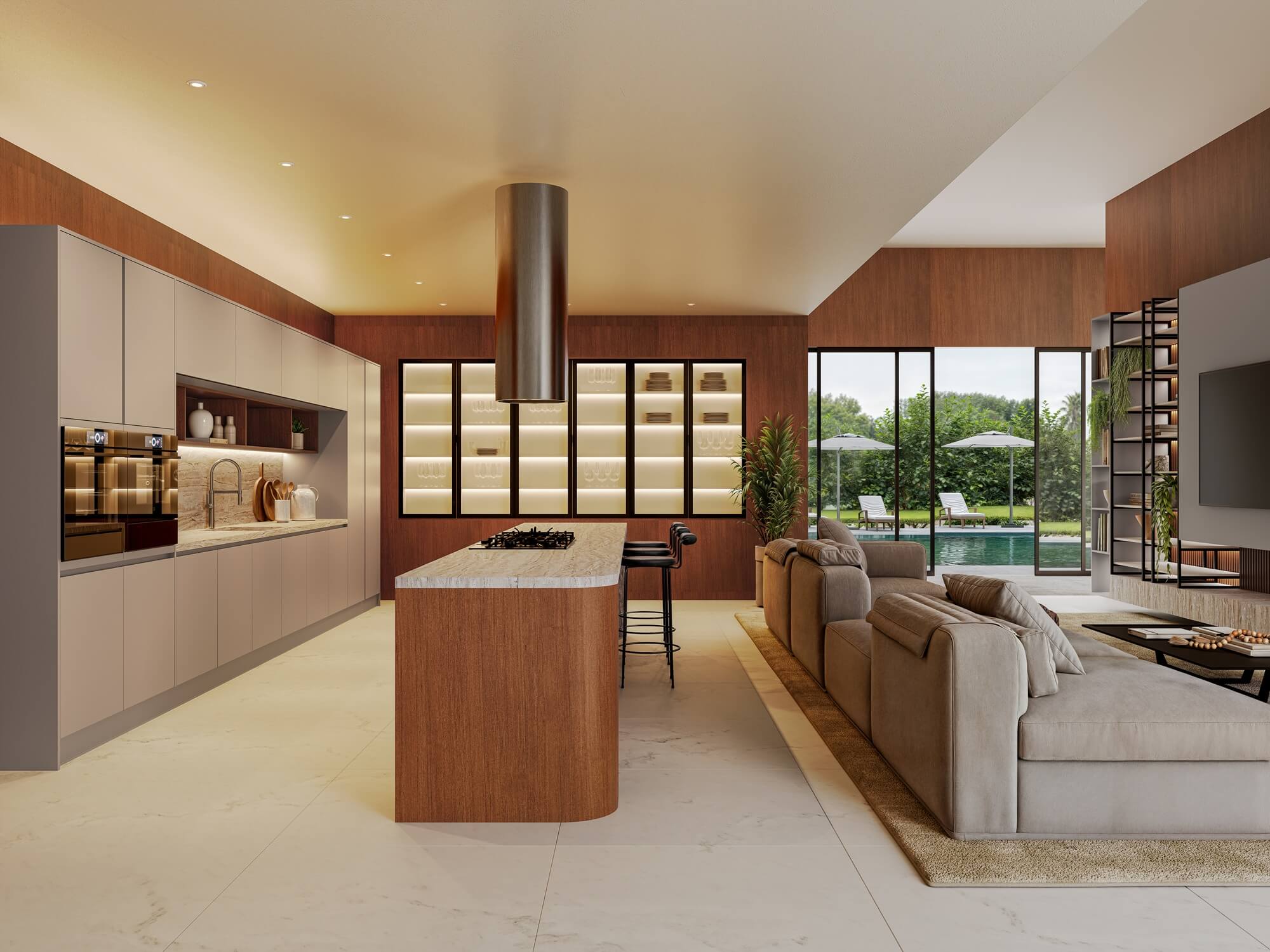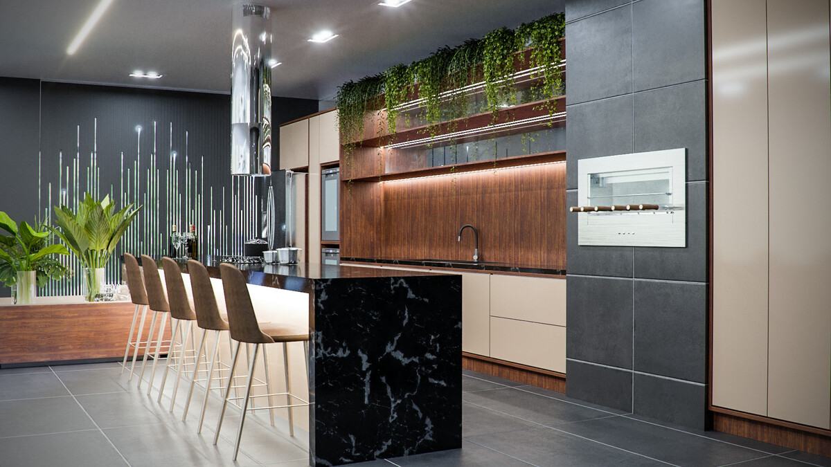 - Cozinha com ilha: adiciona uma ilha central, perfeita para interação e funcionalidade extra, especialmente em cozinha conceito aberto ou em ambientes com sala e cozinha integrada.