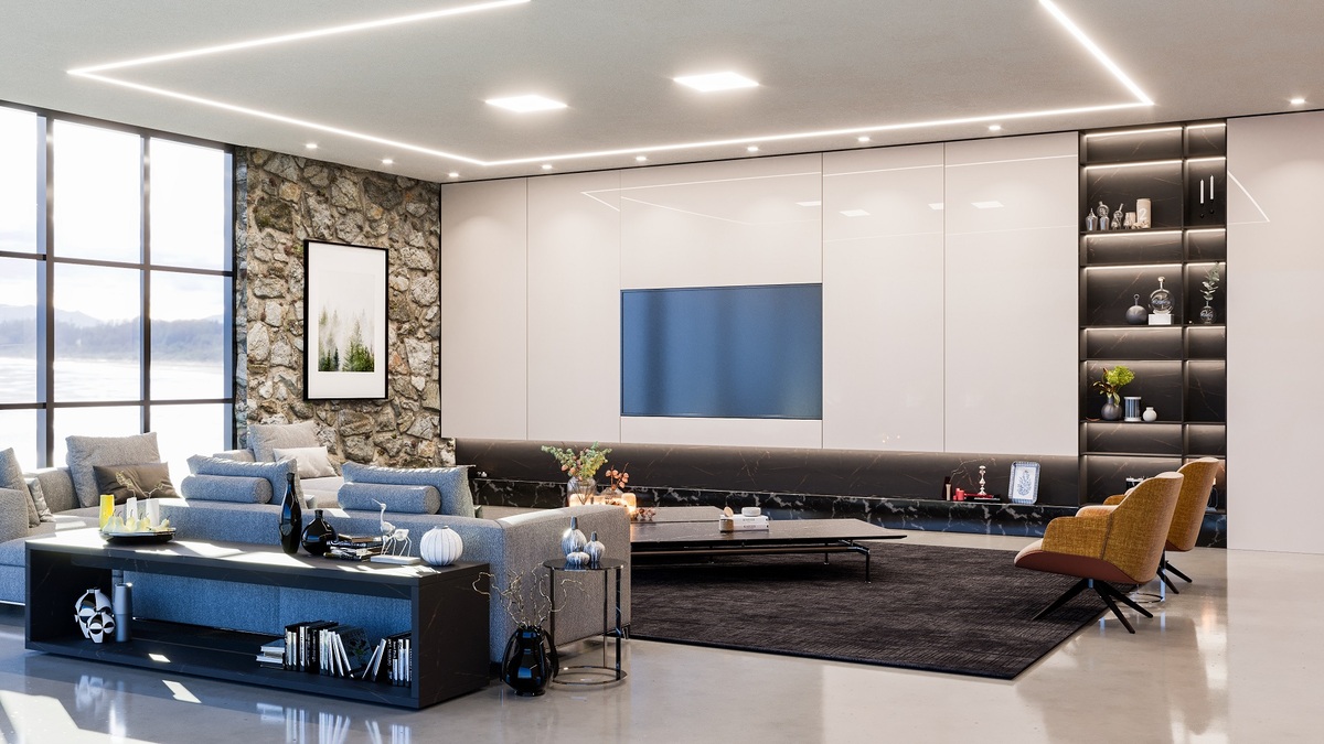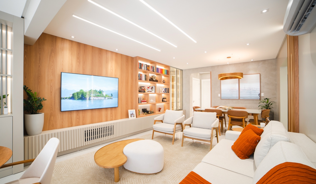 O uso de caixas acústicas embutidas, televisores que se ocultam em painéis e até móveis com carregadores por indução também podem ser aplicados para reforçar a proposta de praticidade e inovação — caso esse seja o objetivo.