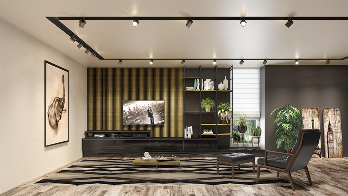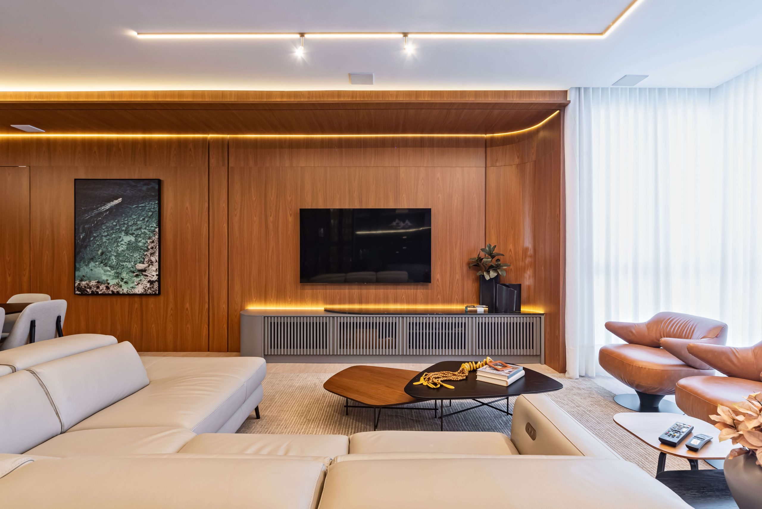 O uso de iluminação indireta e painéis amadeirados também pode ser aplicado aqui para trazer toques de elegância, enquanto soluções como painéis deslizantes para ocultar fios e cabos, reforçando o aspecto contemporâneo.
