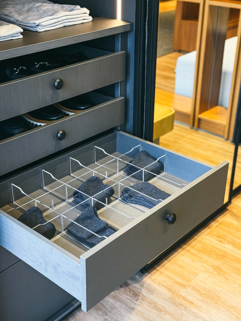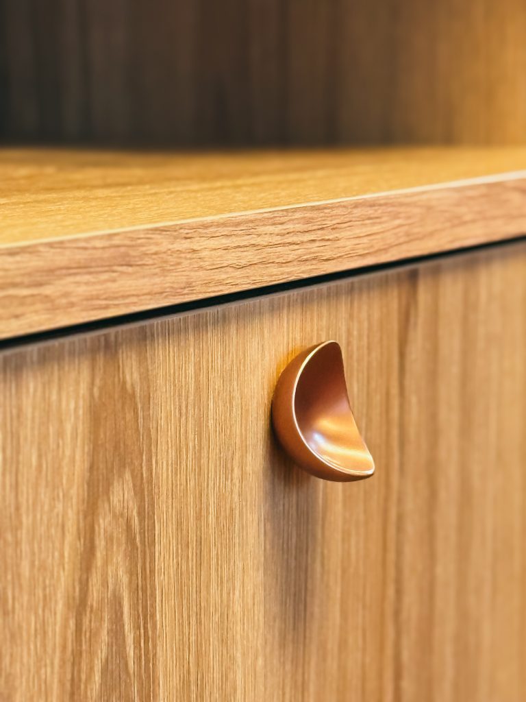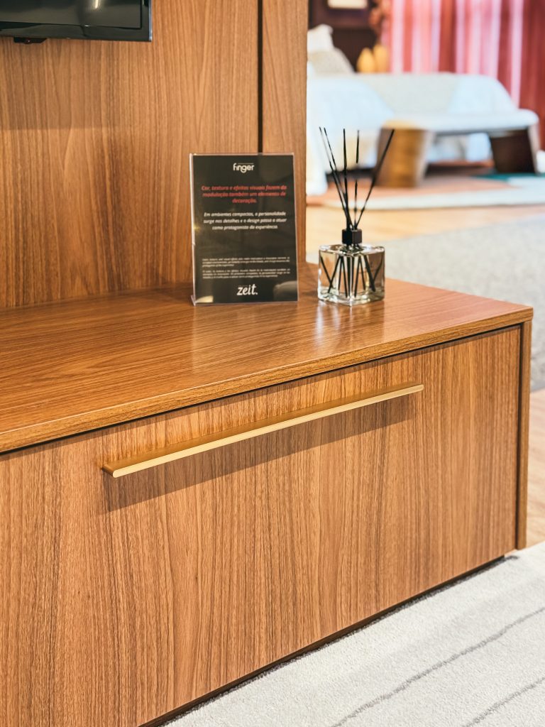 Em peças com módulos largos, por exemplo, se utilizarmos puxadores muito pequenos, eles podem parecer perdidos na superfície. Já em gavetas muito estreitas, usar modelos longos demais pode chamar mais atenção do que o próprio móvel.