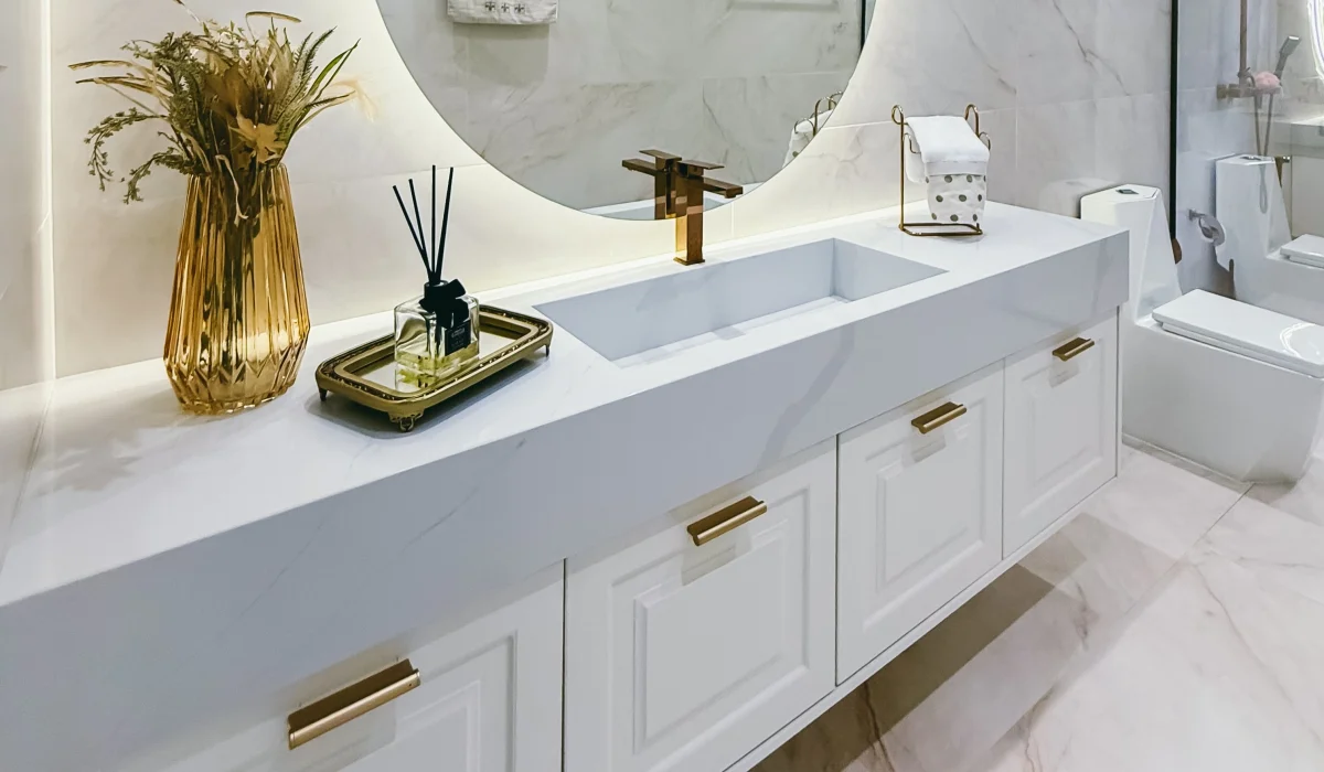 The countertop is a central element in the bathroom, supporting the sink and serving as a surface for daily-use items. Material choices such as marble, granite, quartz, or porcelain directly affect durability, aesthetics, and moisture resistance. Sink options include vessel, undermount, semi-recessed, or integrated models carved directly from the countertop.