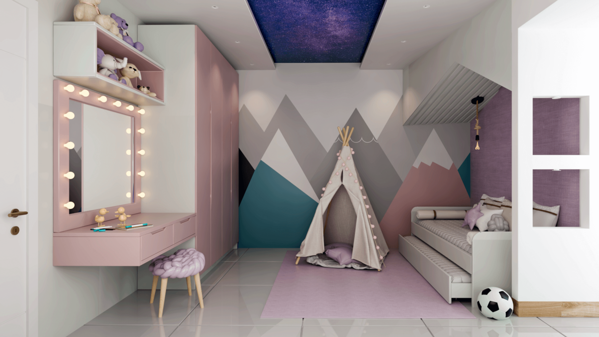 Play areas, drawing spaces, toy storage, and creative corners help foster imagination and self‑esteem. Furniture can include colorful niches, easy‑access shelving, and wall panels for artwork or collages. In geek-themed decor, themed shelves and character-inspired lamps stimulate imagination.